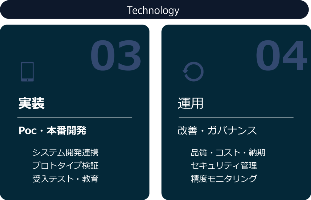 - 実装・開発・PM:当社エンジニアとPMOチームによる構築・テスト。